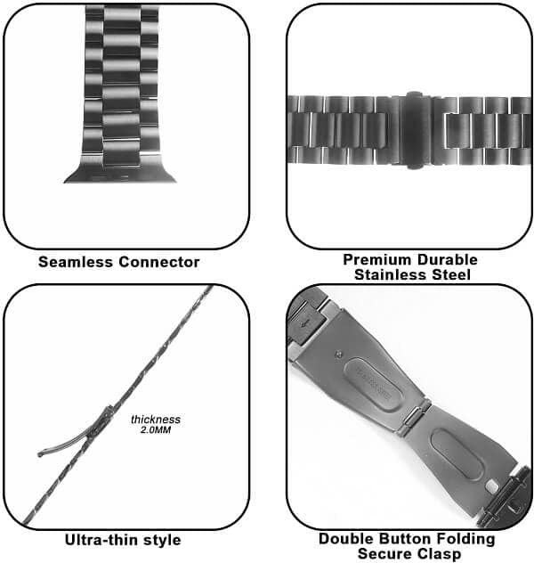 Designed with double button insurance of folding clasp on both sides. It comes with refined steel connectors, easy to take off and install, The stainless steel apple watch band can be shortened or extended using the attached link-remove tool, to fit your wrist perfectly.