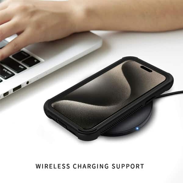 360°full body heavy-duty Apple iPhone 15/15 Pro/15 Pro Max/15 Plus phone case. A high-quality TPU bumper (the frame rugged rubber surrounding the phone case) gives you Military Grade Drop Protection, and it's also slightly higher than the screen and back shell considers that your screen and camera will not wear out even when placed.