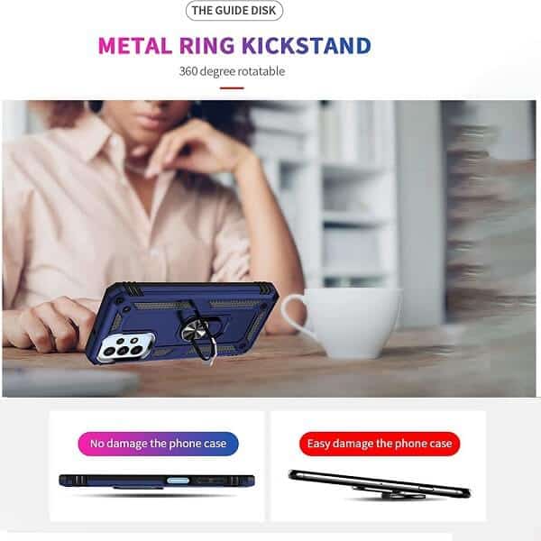 - Ring Kickstand with 360-degree rotation makes cell phone stand up firmly to provide horizontal or vertical hands-free viewing.